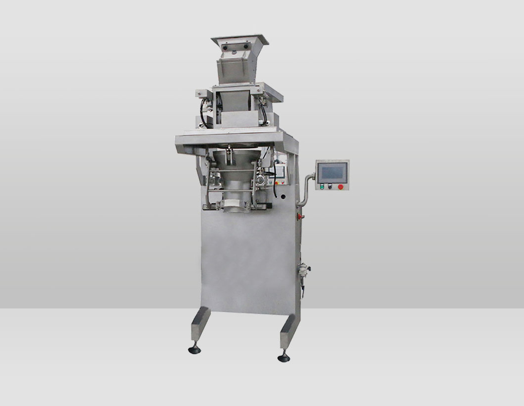 該機主要工作流程為設定好包裝重量后,人工將包裝袋套到氣動夾袋機構,啟動灌裝開始按鈕,夾袋機構自動將袋子夾住,然后往包裝袋中進行放料,放料過程分為粗加料和精加料兩個階段,且加料過程中可選配除塵及抽真空工藝。達到標定重量后,夾袋機構自動脫開,人工將包裝袋搬至皮帶輸送機上進行抽氣、封口等工序。